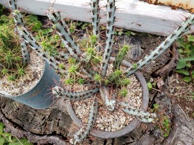 ブルーがかったグリーンの枝に棘が美しいユーフォルビアです。