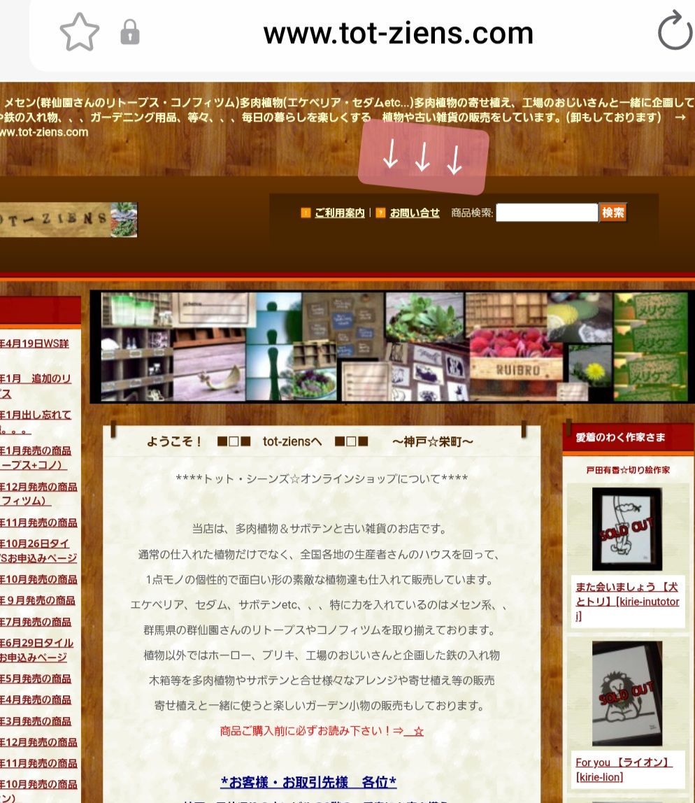 サボテン、メセン(群仙園さんのリトープス・コノフィツム)多肉植物(エケベリア・セダムetc...)多肉植物の寄せ植え、工場のおじいさんと一緒に企画している木箱や鉄の入れ物、、、ガーデニング用品、等々、、、毎日の暮らしを楽しくする 植物や古い雑貨の販売をしています。(卸もしております)  → https://www.tot-ziens.com